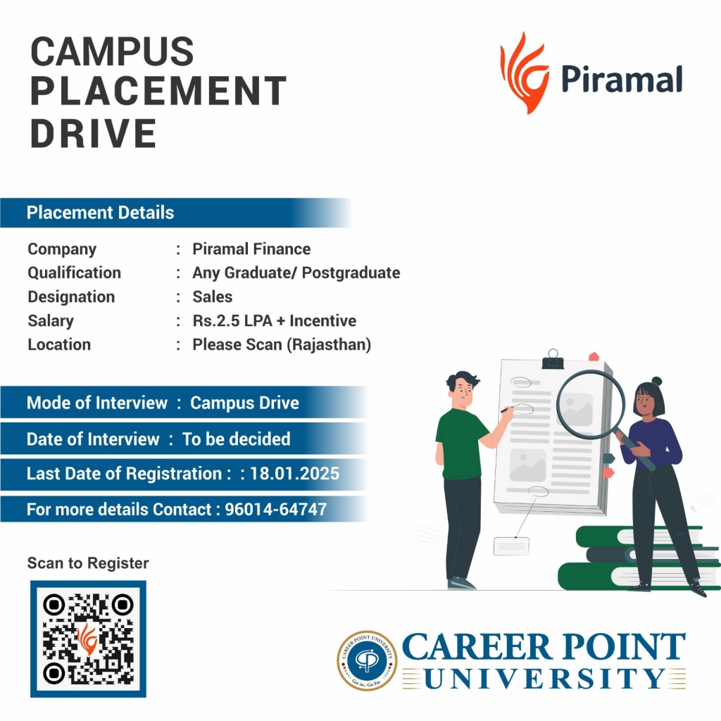 Career Point University is delighted to announce a Campus Placement Drive in collaboration with Piramal Finance, offering a promising career opportunity for students and alumni.