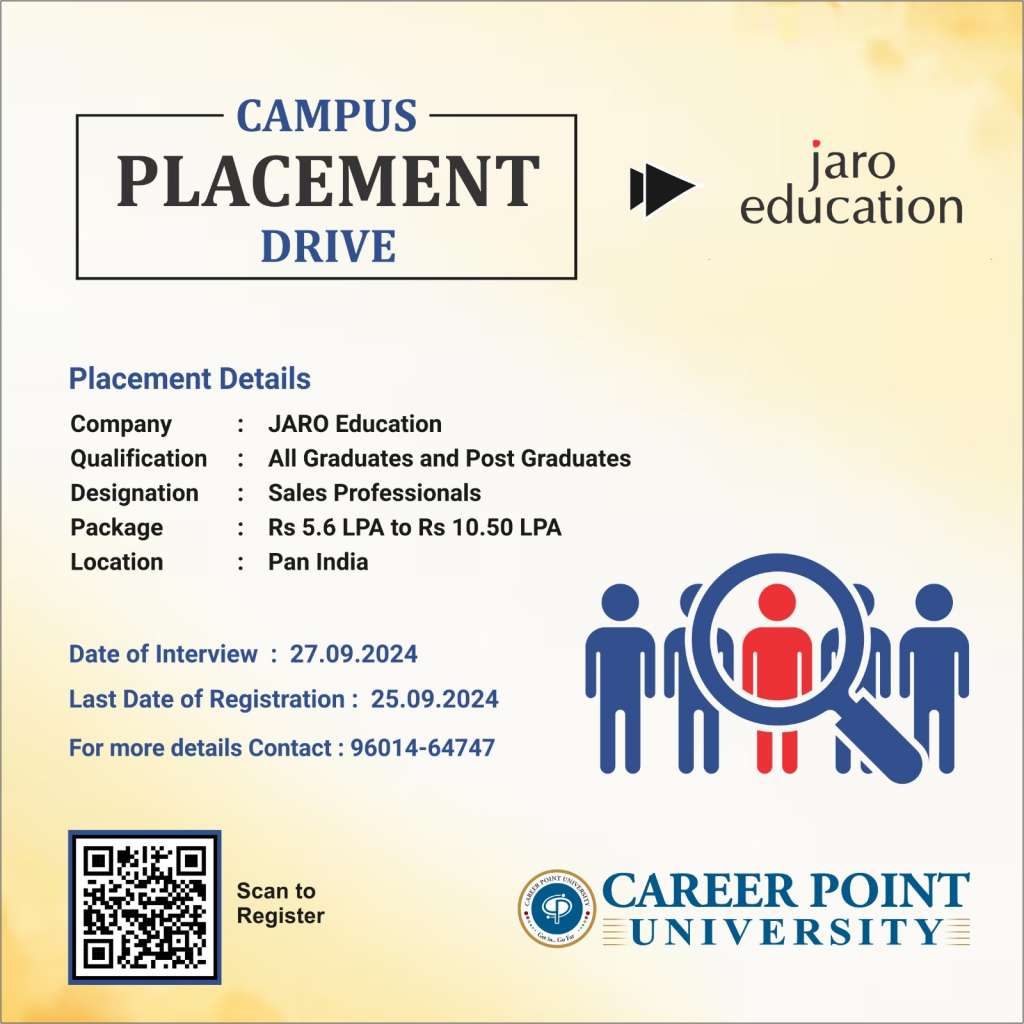 Career Point University is excited to announce an incredible opportunity for students to kickstart their careers through the upcoming Campus Placement Drive by JARO Education. This prestigious placement drive is a golden chance for both graduates and postgraduates to secure rewarding positions in one of the leading companies in the education sector.