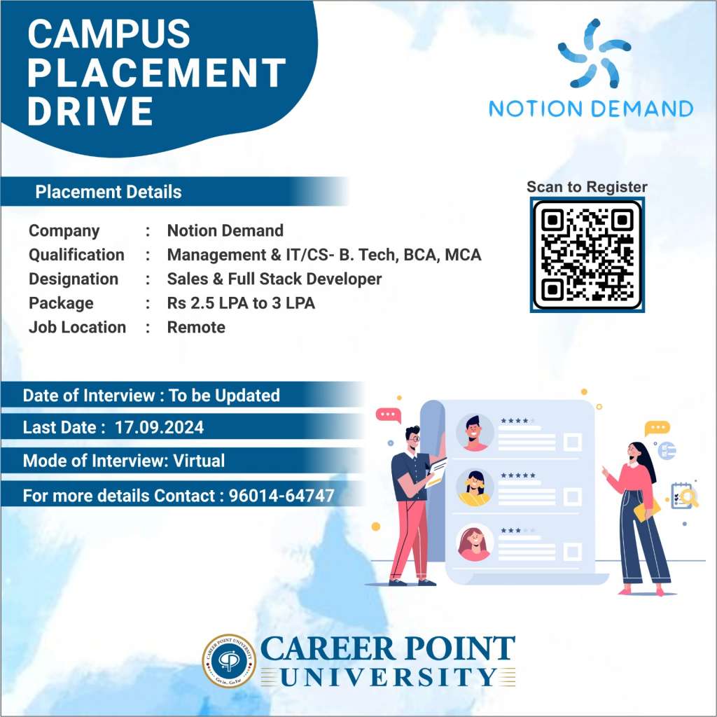 We are thrilled to announce an exciting Campus Placement Drive at Career Point University for students in the fields of Management and IT/Computer Science. This placement drive offers a fantastic opportunity to work with Notion Demand, a renowned company offering remote job positions.