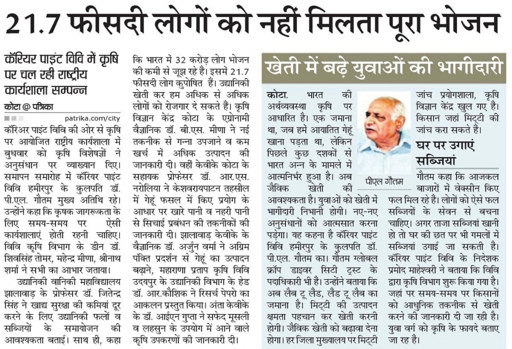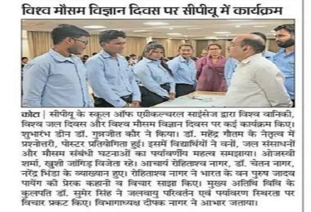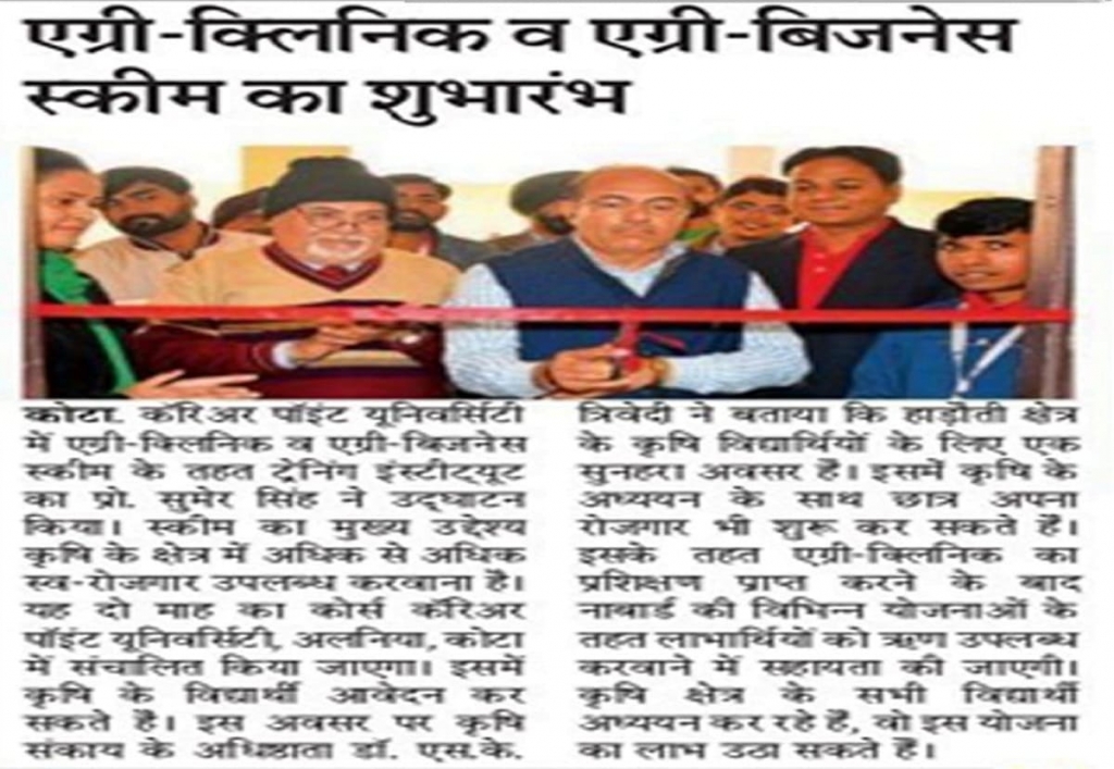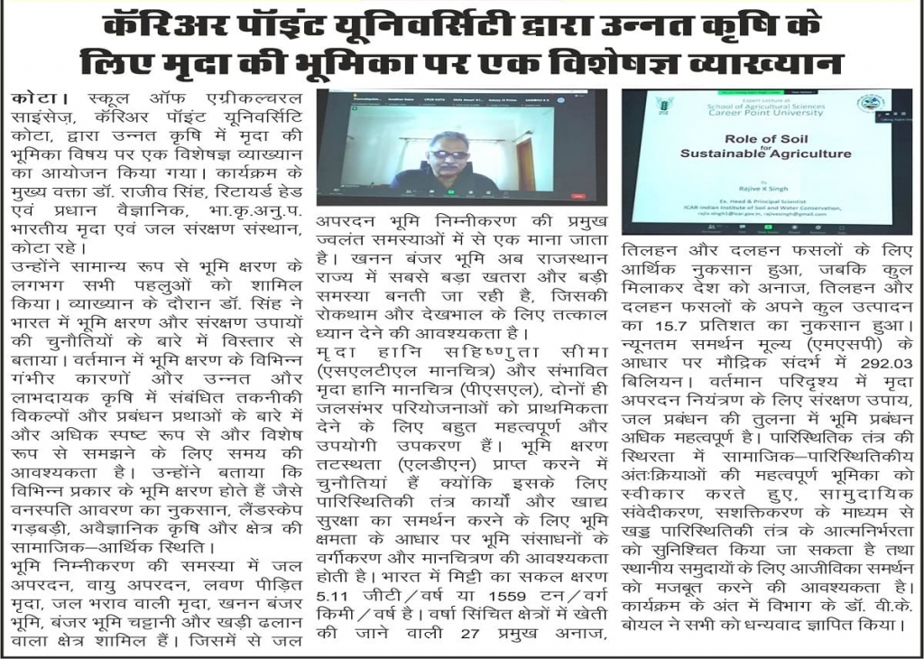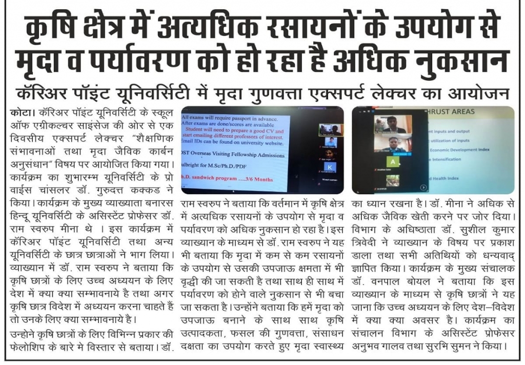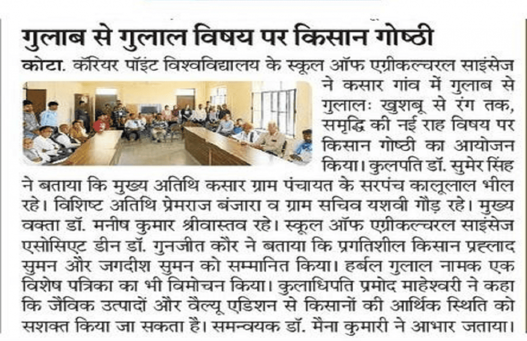 The School of Agricultural Sciences, Career Point University, Kota, in collaboration with ATMA, organized a two-day farmer training program on natural farming. Experts shared insights on soil health, water conservation, pest management, and crop production techniques. The initiative aimed to promote self-reliant farming practices under Atmanirbhar Bharat Abhiyan.