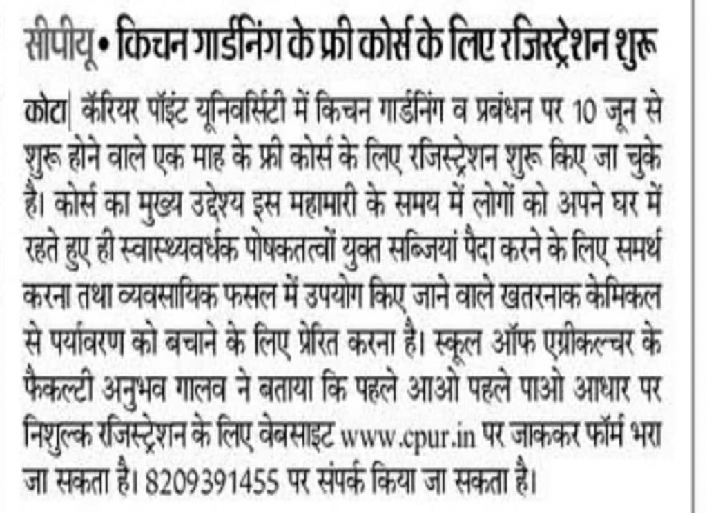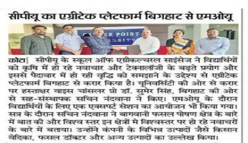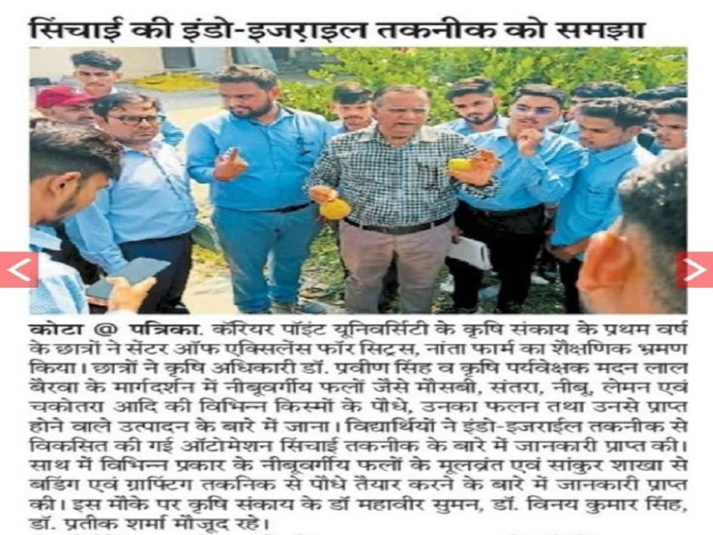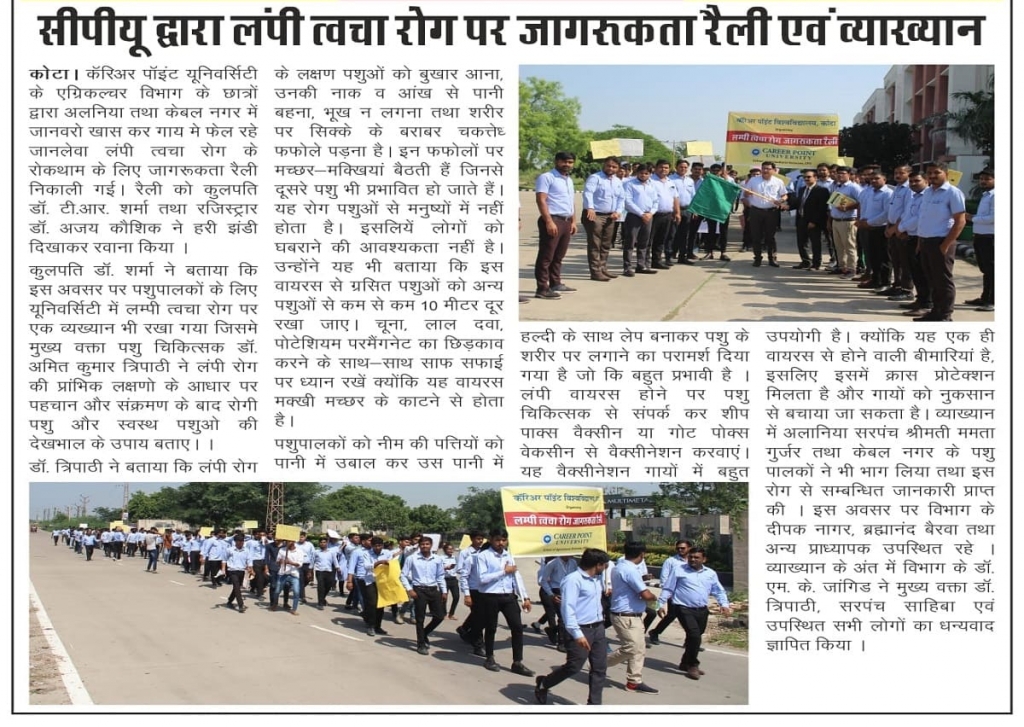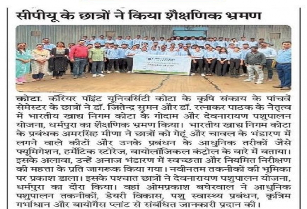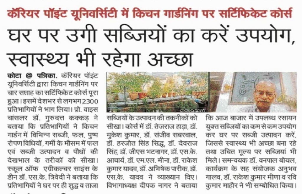 The School of Agricultural Sciences, Career Point University, Kota, in collaboration with ATMA, organized a two-day farmer training program on natural farming. Experts shared insights on soil health, water conservation, pest management, and crop production techniques. The initiative aimed to promote self-reliant farming practices under Atmanirbhar Bharat Abhiyan.
