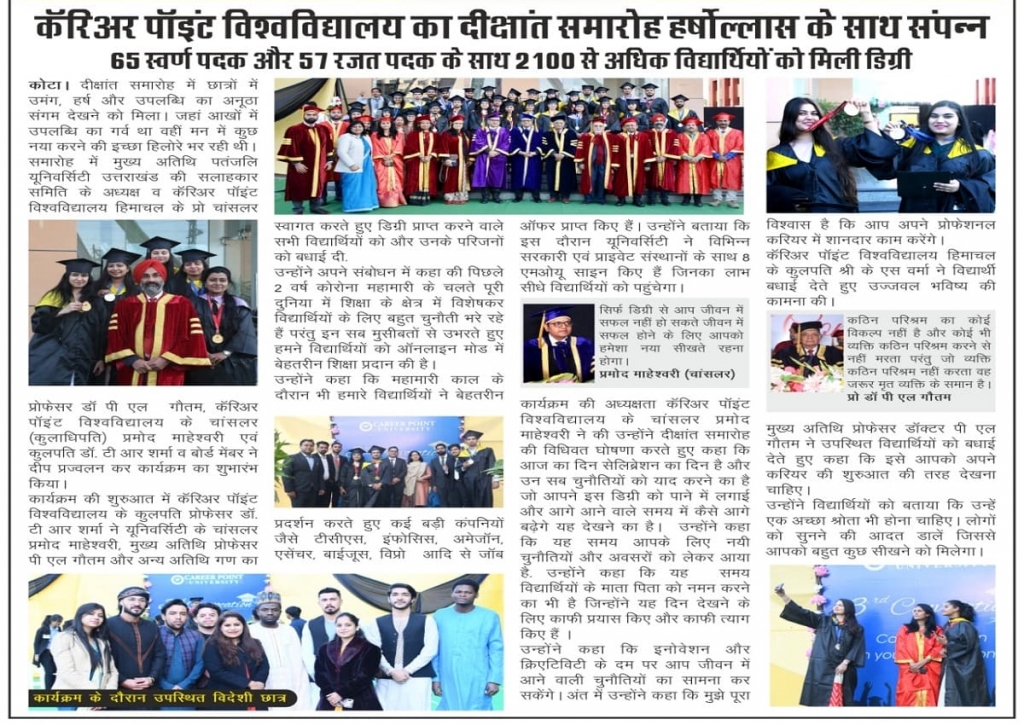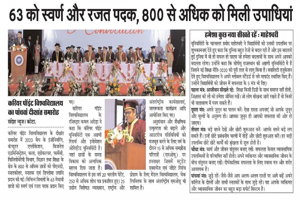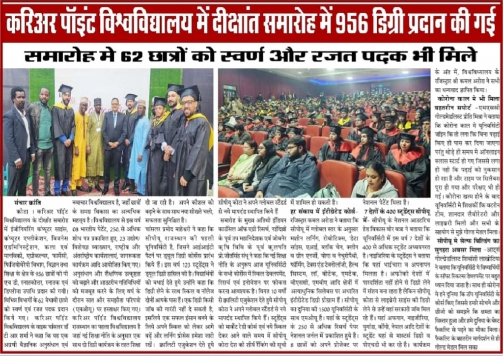 Career Point University, Kota marked its 7th Convocation by awarding over 800 degrees, 27 gold and 22 silver medals, and 80 PhDs. The ceremony highlighted strong placement outcomes, with top packages reaching ₹18 lakh and an average of ₹4.5 lakh, reflecting the university’s growing academic excellence.