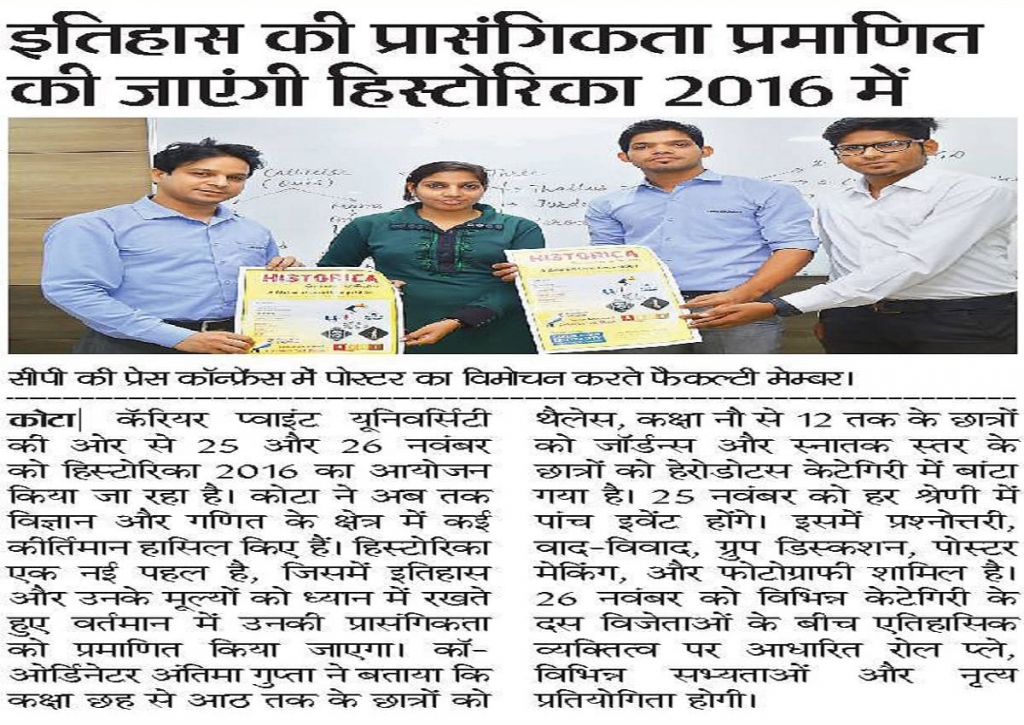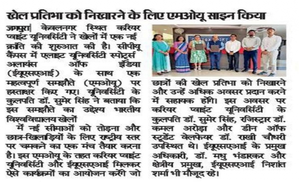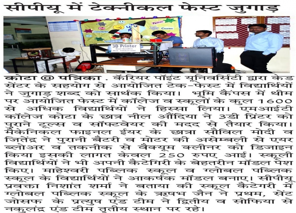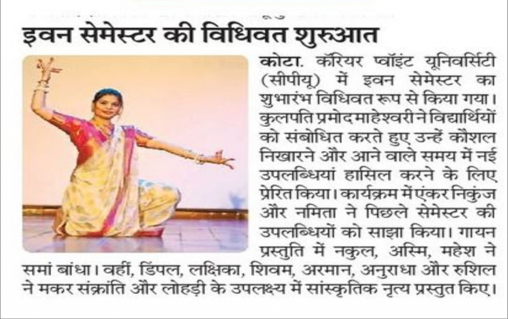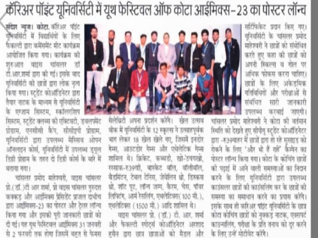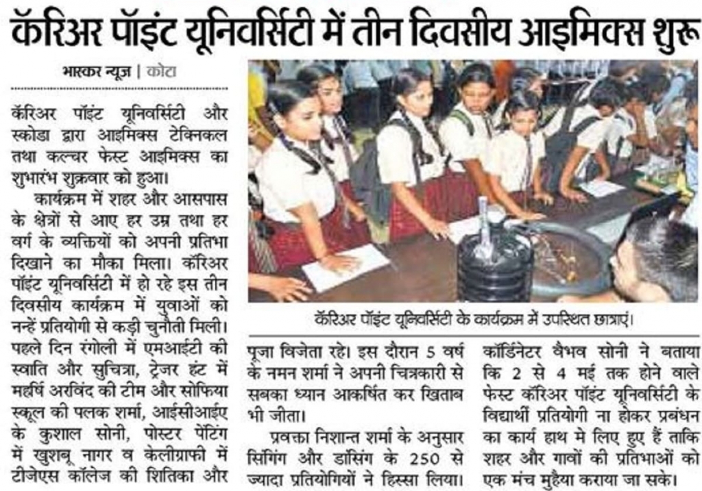 Career Point University, in collaboration with Skoda, launched its 3-day techno-cultural fest Imix, featuring over 250 participants in events like Rangoli, Singing, and Poster Painting. The fest highlighted talent from Kota and nearby areas, with CPU students managing the entire event.