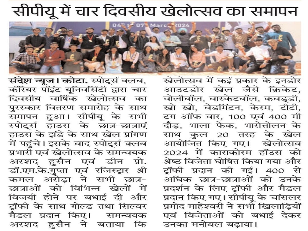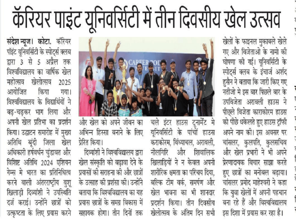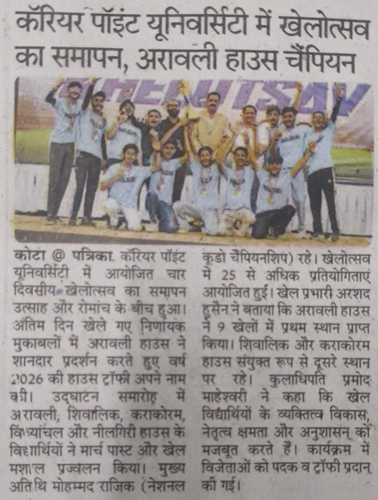 The annual sports festival wrapped up on a high note with Aravali House securing the overall championship after leading in multiple events. With 25+ competitions, an impressive march past, and medal ceremonies, the celebration promoted fitness, leadership, and discipline among students, adding vibrant energy to the university campus in Kota.