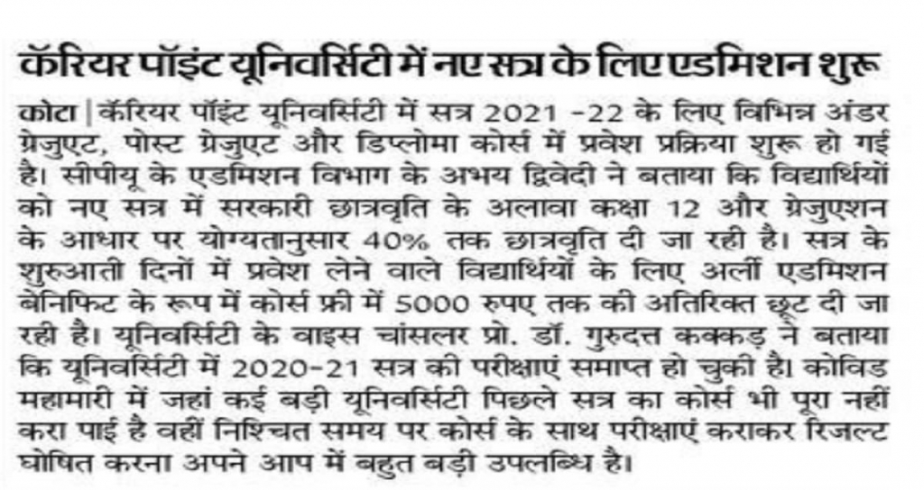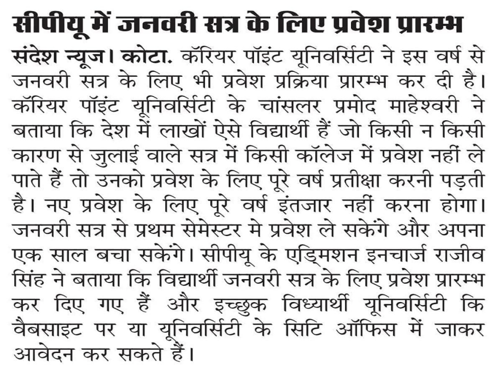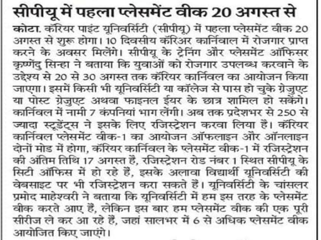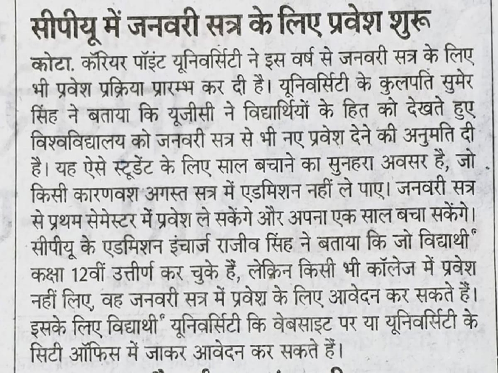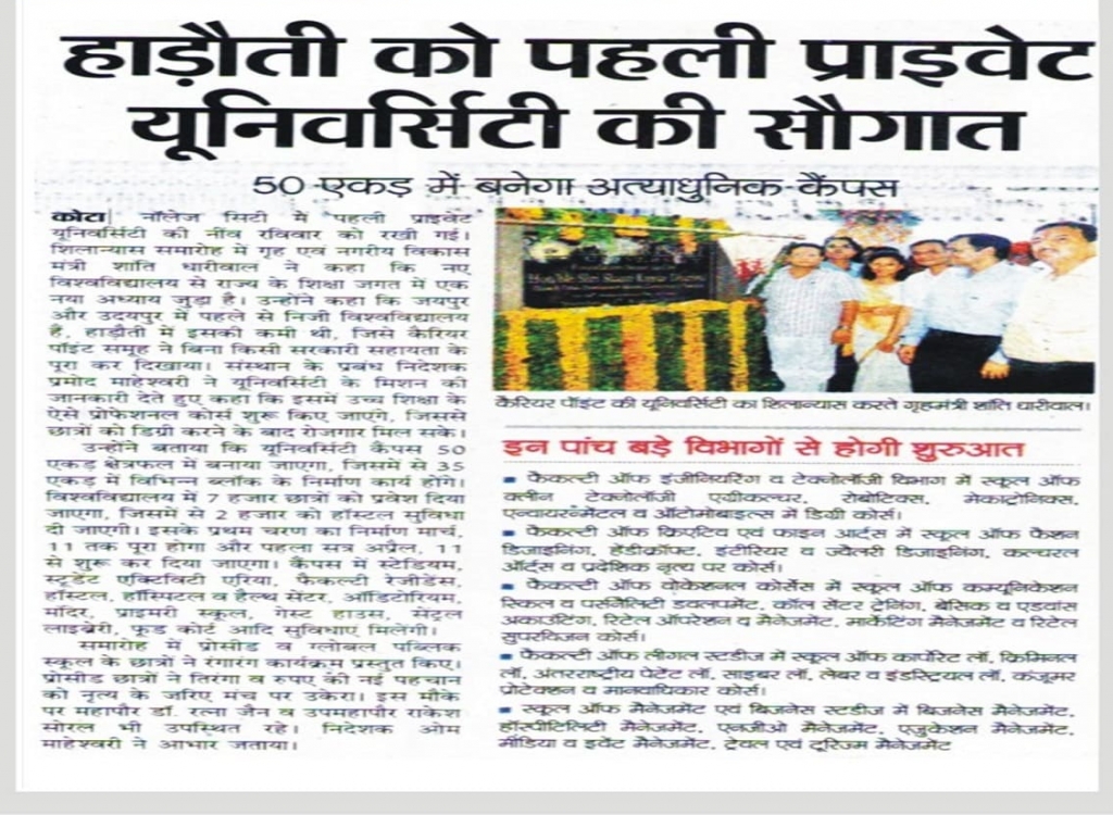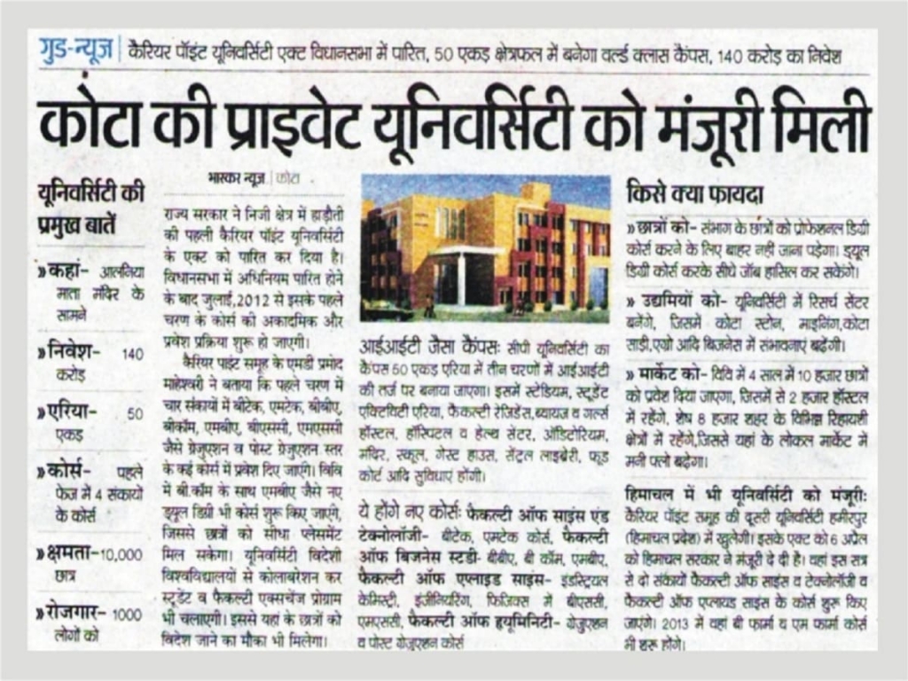 Career Point has become Kota’s first private university under the Private University Act, offering admissions from 2012–13. With a 50-acre campus and global academic focus, it emphasizes quality education and practical learning.