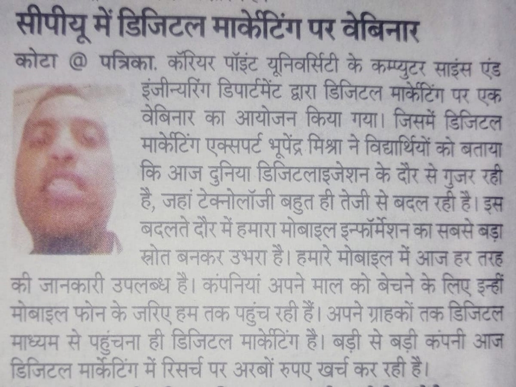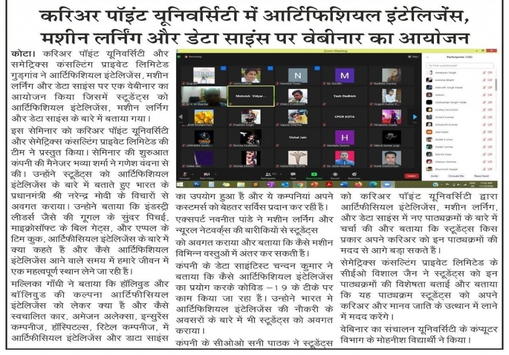 Career Point University’s School of Computer Applications held a 30-day Python and Machine Learning Bootcamp, led by experts from Grass Company, Jaipur. Students gained hands-on experience in Python, data analysis, machine learning algorithms, and tools like ChatGPT and DALL·E. The bootcamp also included resume-building sessions to boost job readiness.