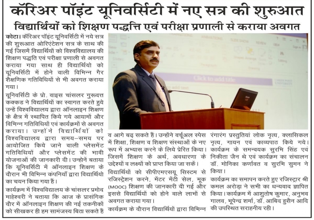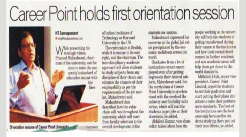 Career Point University held its first orientation session, where Chairman Pramod Maheshwari shared a vision to match global standards like IITs and Harvard. The focus was on interdisciplinary, industry-driven learning and student employability.
