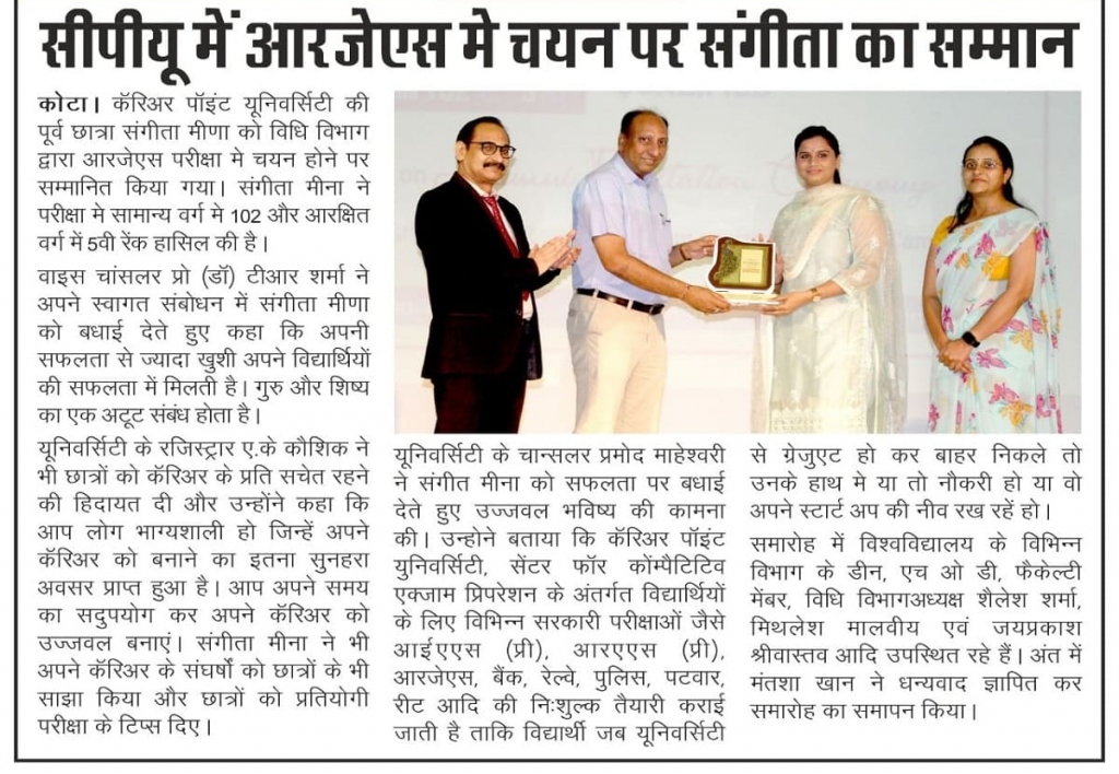 Career Point University honored Jitendra, a young innovator from a farmer’s family, for creating the robotic water missile 'Shaheed'. Inspired by Dr. APJ Abdul Kalam, he encouraged students to prioritize innovation, curiosity, and meaningful contribution over mere success.