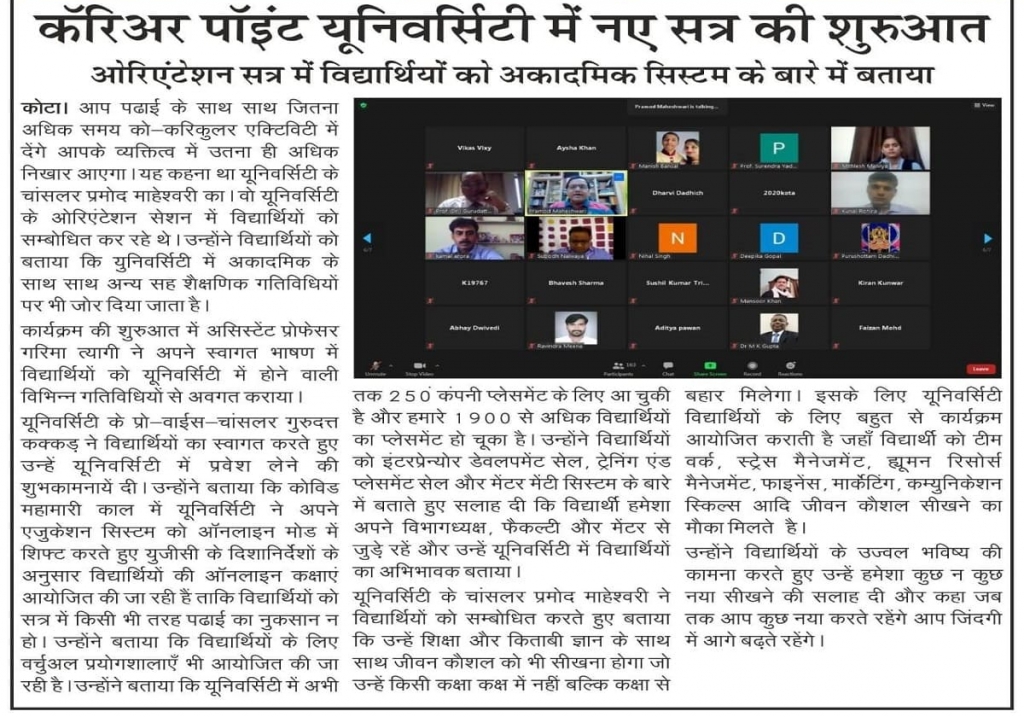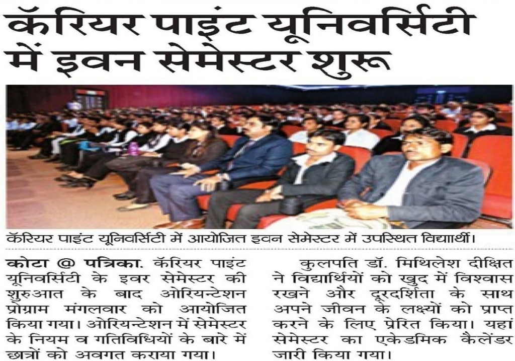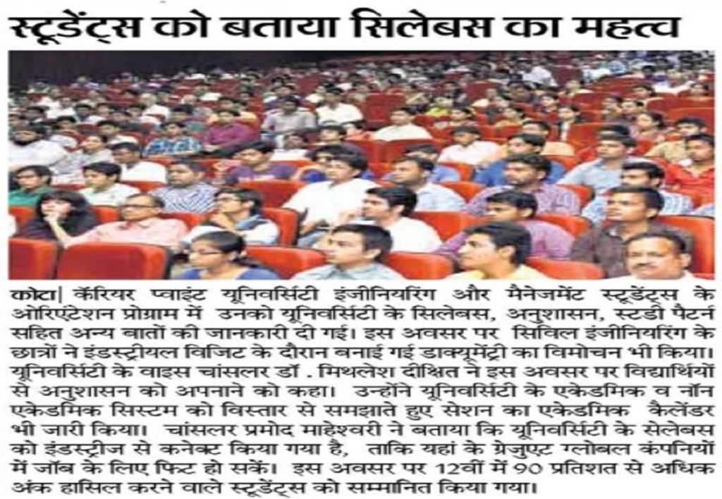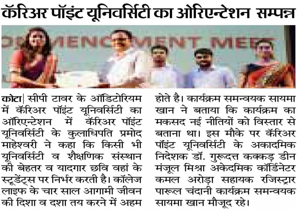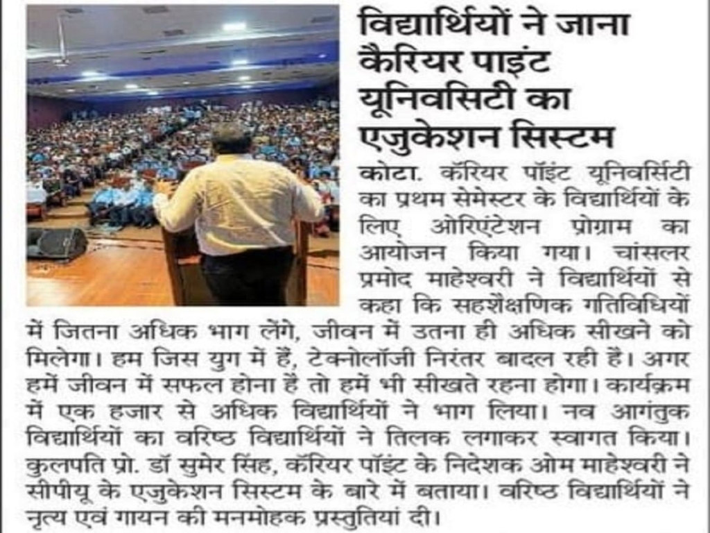 Career Point University organized an orientation for engineering and management students, highlighting its industry-focused syllabus and academic culture. A student documentary was showcased, and meritorious students were felicitated by VC Dr. Mithlesh Dixit and Chancellor Pramod Maheshwari.