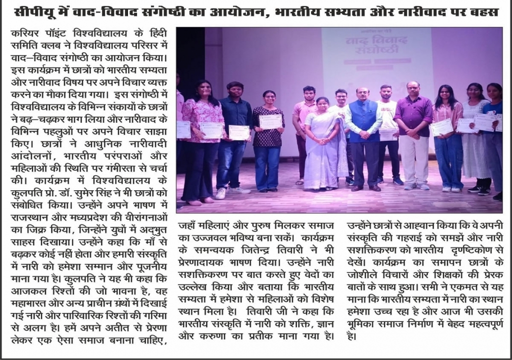 Career Point University hosted a national inter-university essay competition on India's Role in Global Affairs in collaboration with ICWA, New Delhi. Over 150 students from premier institutions participated, with CPU’s Dreamy Jain winning first place in the UG category.