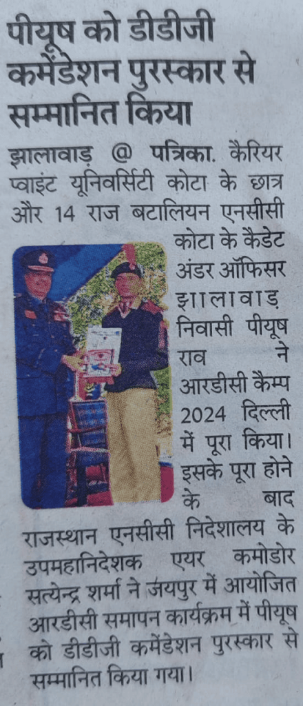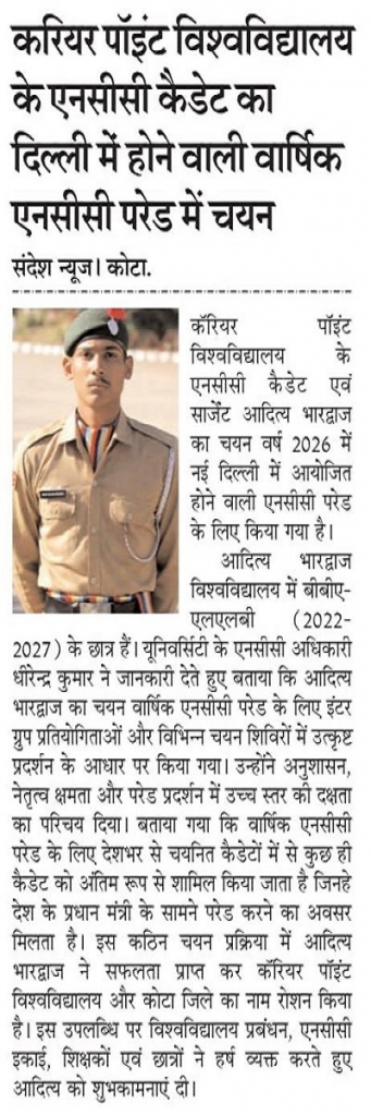 NCC Cadet and Sergeant Aditya Bhardwaj of Career Point University has been selected for the 2026 Annual NCC Parade in New Delhi, bringing pride to the university and Kota district through his exceptional discipline, leadership, and parade excellence.