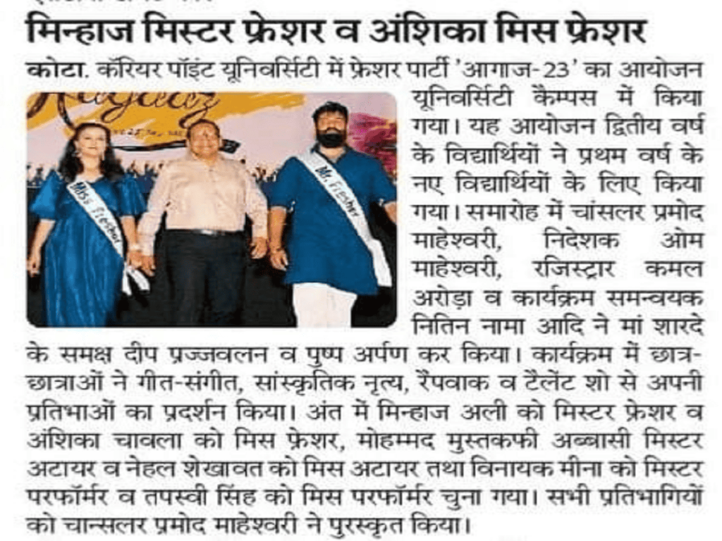 Career Point University, Kota, celebrated its grand freshers’ party Aagaaz 25, where seniors welcomed newcomers with warmth, tilak, and vibrant performances. The joyous event fostered new bonds and marked fresh beginnings, with Chancellor Pramod Maheshwari inspiring students to learn and grow. Mayank Kumar and Simran Bhalla were crowned Mr. and Miss Fresher.