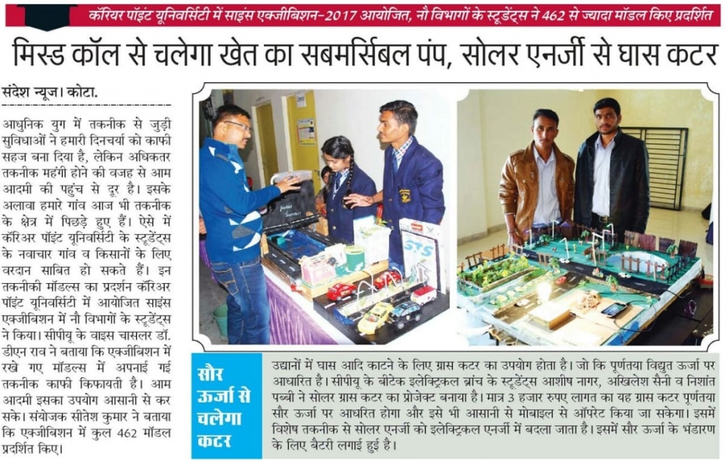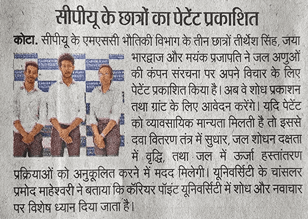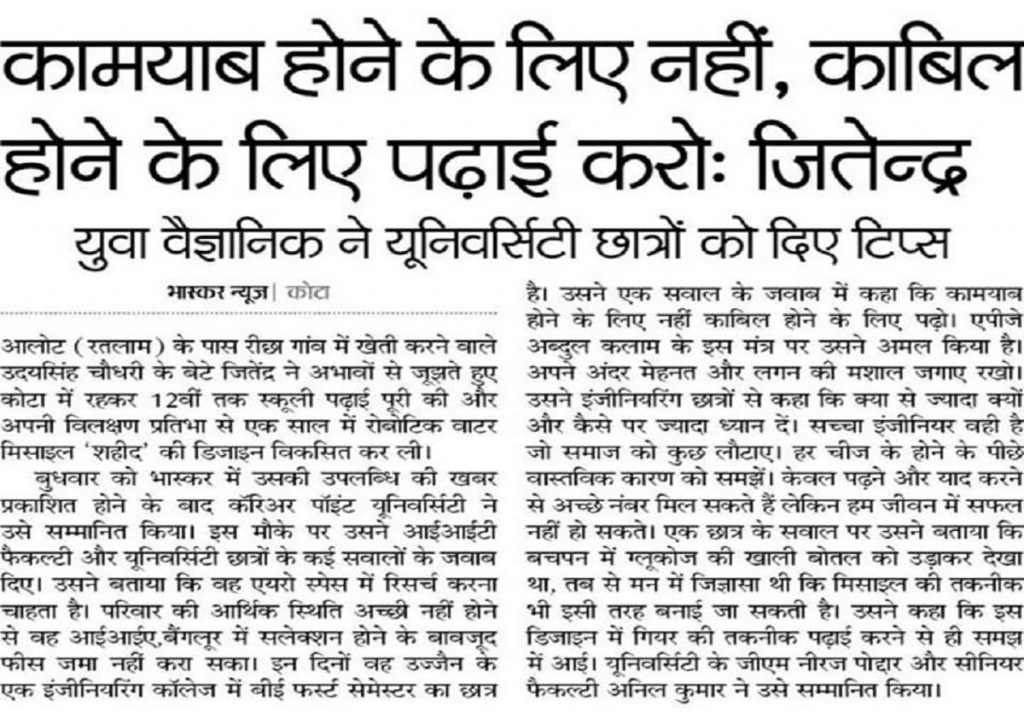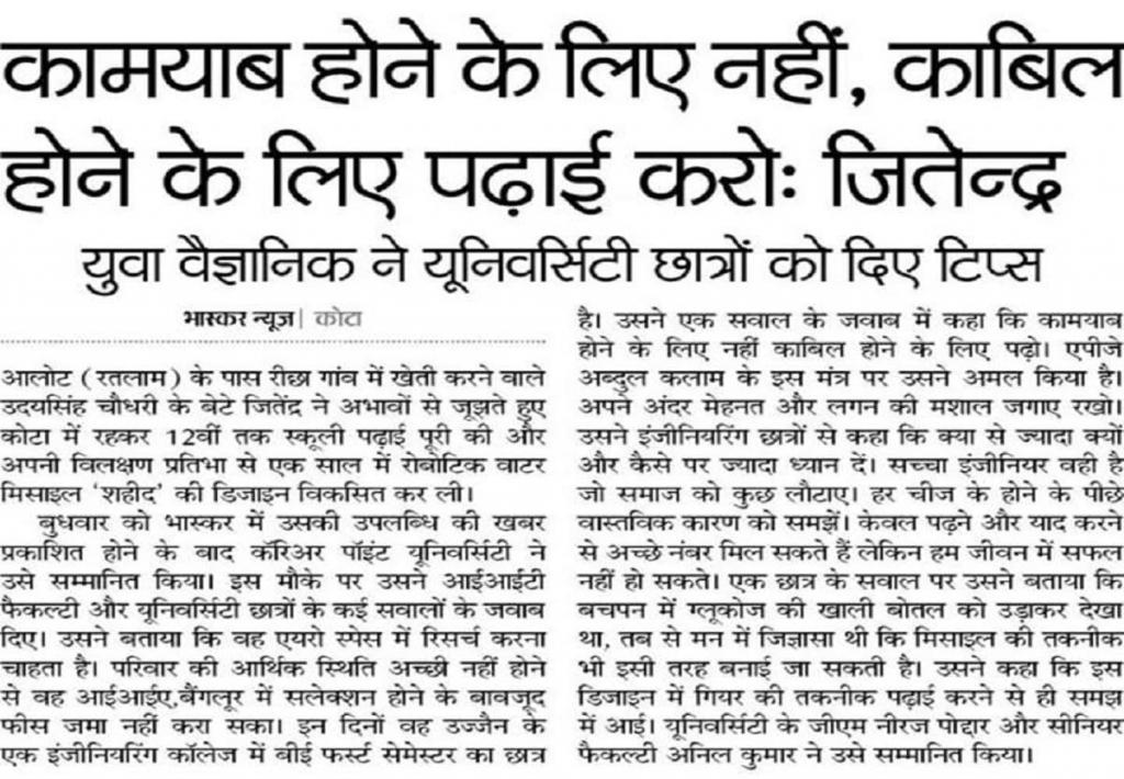 Career Point University honored young innovator Jitendra from Ratlam for creating a robotic water missile, ‘Shaheed’. He encouraged students to value curiosity and perseverance over success, aiming to pursue aerospace research despite financial challenges.