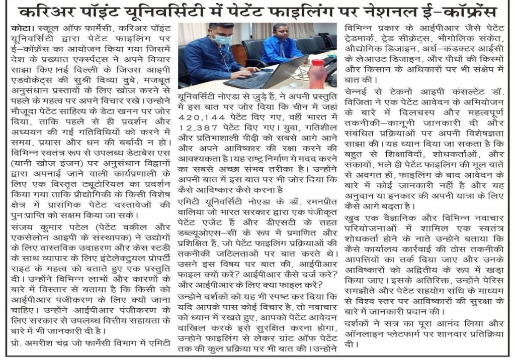 Career Point University hosted a successful Patent Clinic workshop led by Dr. Arvind Kumar Sharma, providing participants with practical insights into IPR, patent drafting, and filing procedures, while university leadership highlighted the crucial role of patents in driving innovation and safeguarding creative rights.