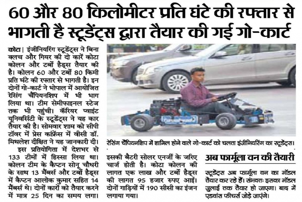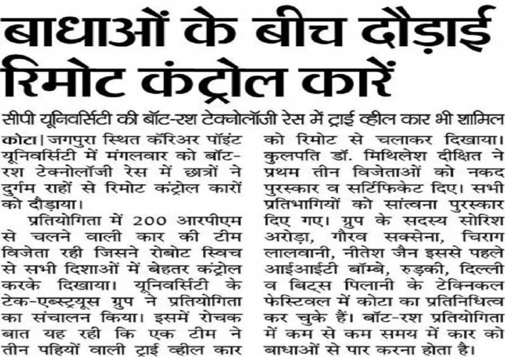 Career Point University hosted the Bot-Rush Technology Race, featuring remote-controlled and tri-wheel cars navigating obstacles. The winning team impressed with a 200 RPM robot, and top performers were honored by Vice Chancellor Dr. Mithilesh Dixit.