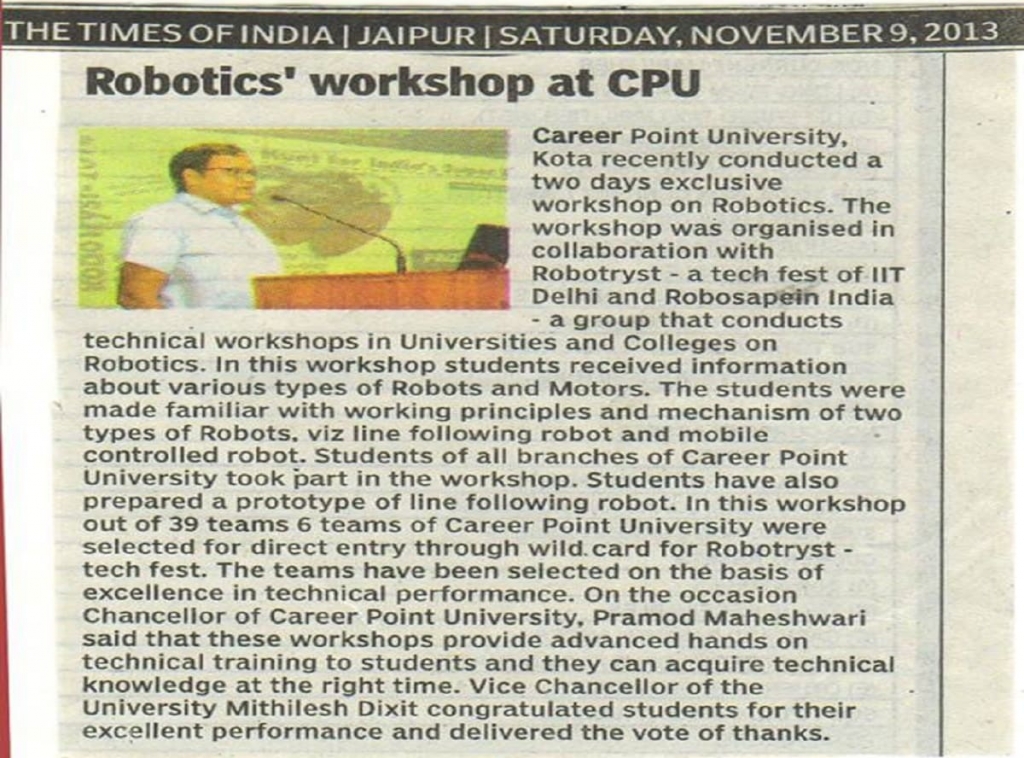 Career Point University, Kota hosted a two-day robotics workshop with IIT Delhi’s Robotryst and Robosapiens India, where students built mobile and line-following robots. Six CPU teams earned direct wildcard entries to Robotryst for their exceptional performance.