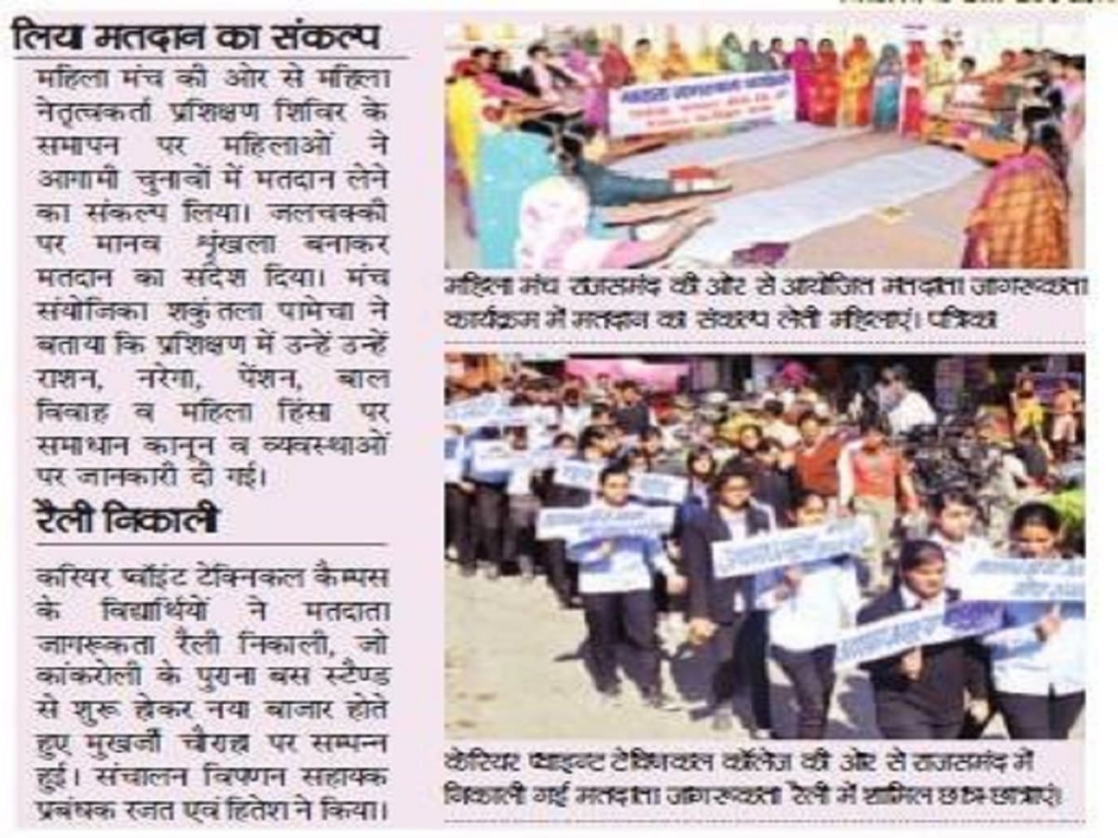 In Rajsamand, women pledged to vote during a Mahila Manch training camp, spreading awareness through a human chain. Meanwhile, Career Point Technical Campus students held a voter awareness rally through the city to encourage electoral participation.