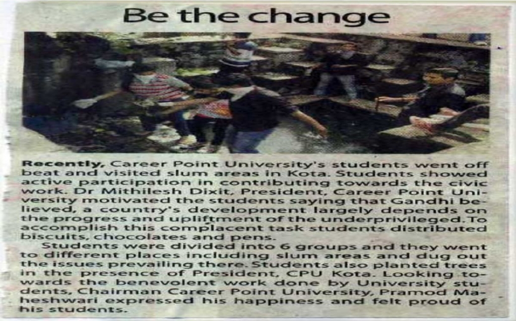Career Point University students conducted a civic awareness drive in Kota’s slum areas by distributing essentials and planting trees. The initiative, supported by President Dr. Mithilesh Dixit and praised by Chairman Pramod Maheshwari, promoted community upliftment.