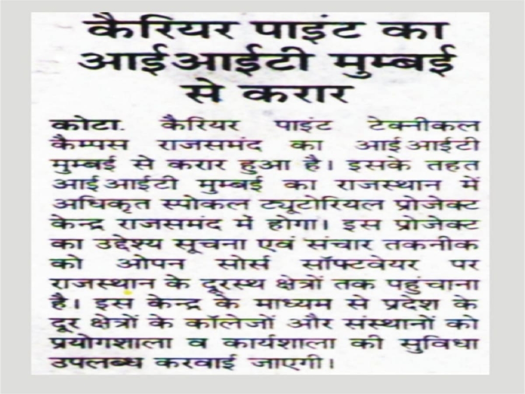 Career Point Technical Campus, Rajsamand, has partnered with IIT Bombay to become Rajasthan’s official Spoken Tutorial Project Center. This MoU promotes open-source ICT education and provides lab and workshop access to rural institutions.