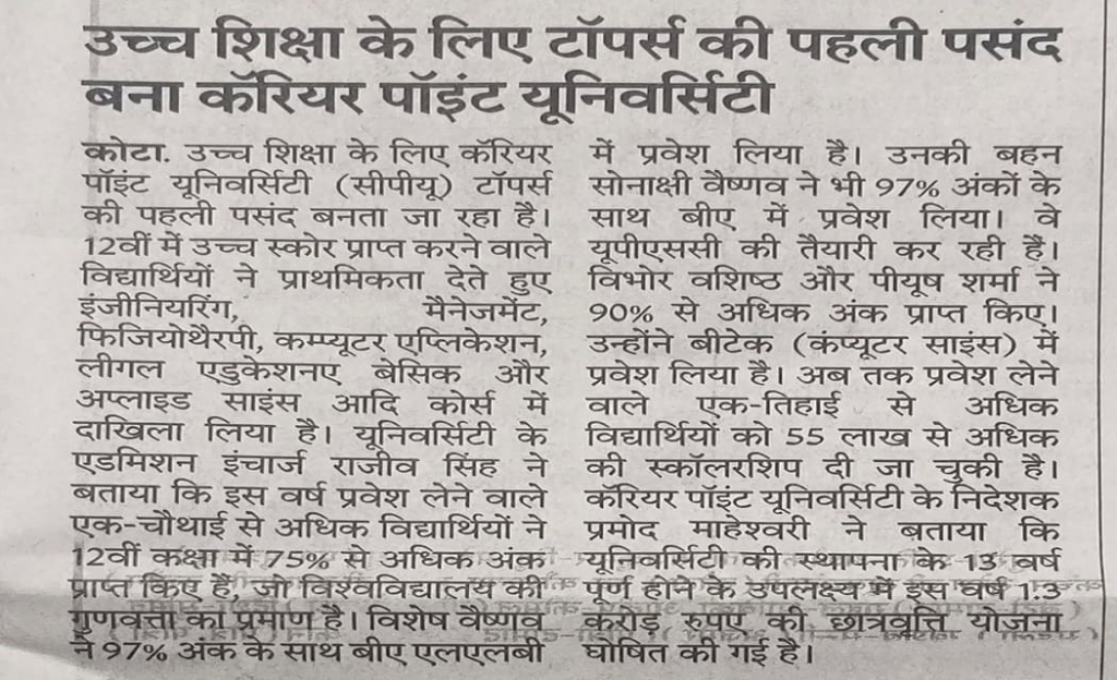 Career Point University, Kota is becoming a top choice for high achievers in Engineering, Management, Law, and Science. Over 25% of enrolled students scored above 75% in Class 12. CPU has awarded ₹55 lakh in scholarships and announced a ₹1.35 crore scholarship scheme.