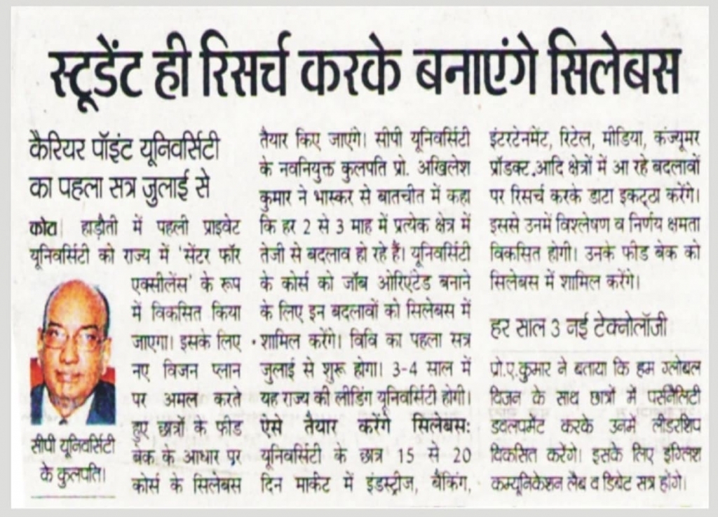 Career Point University will launch its first session in July with a dynamic, industry-driven syllabus shaped by student research. VC Prof. Akhilesh Kumar emphasized real-world learning across sectors like banking, media, and retail to boost analytical and decision-making skills.