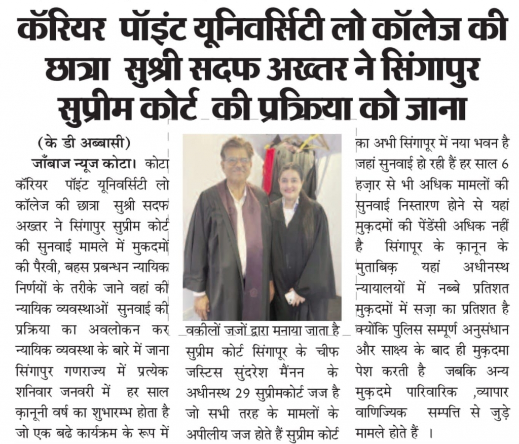 Sadaf Akhtar, a law student at Career Point University, Kota, gained insights into Singapore’s judicial system, including case hearings, debate management, and legal procedures at the Supreme Court. She observed how efficiency and thorough investigation contribute to high conviction rates and low case pendency.
