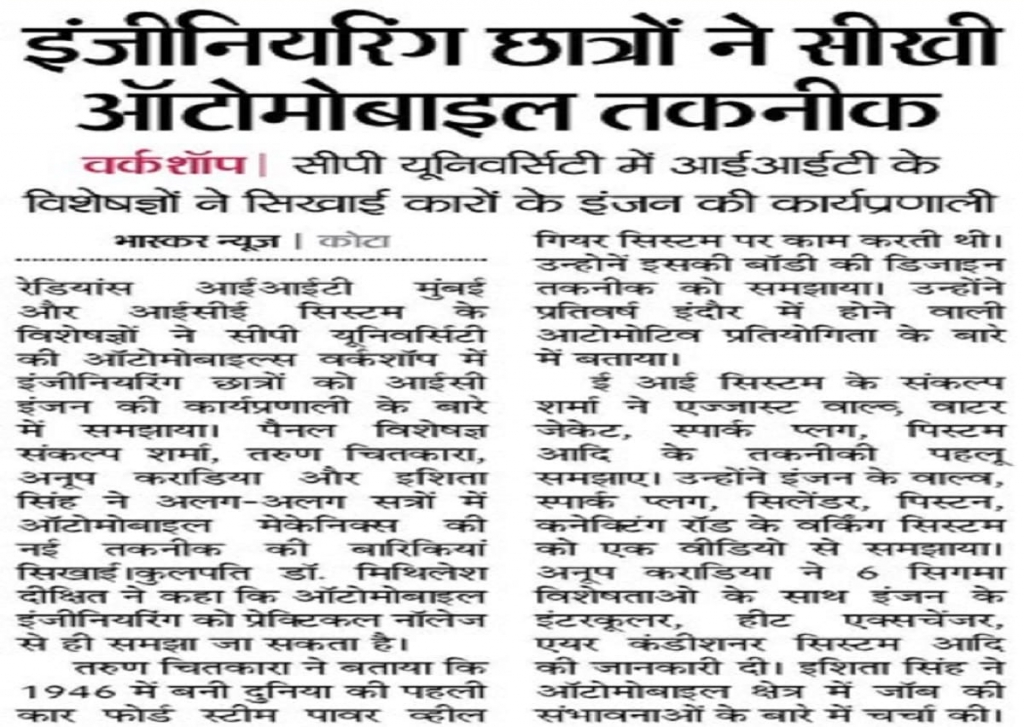 Career Point University hosted an automobile workshop with experts from Radiance IIT Mumbai and EI Systems, focusing on IC engines and key automotive components. Students gained practical insights into engine mechanics, exhaust systems, and Six Sigma applications.