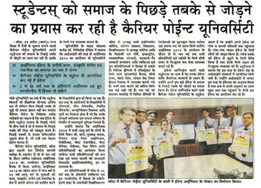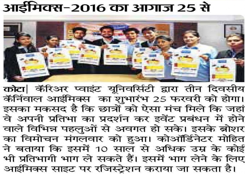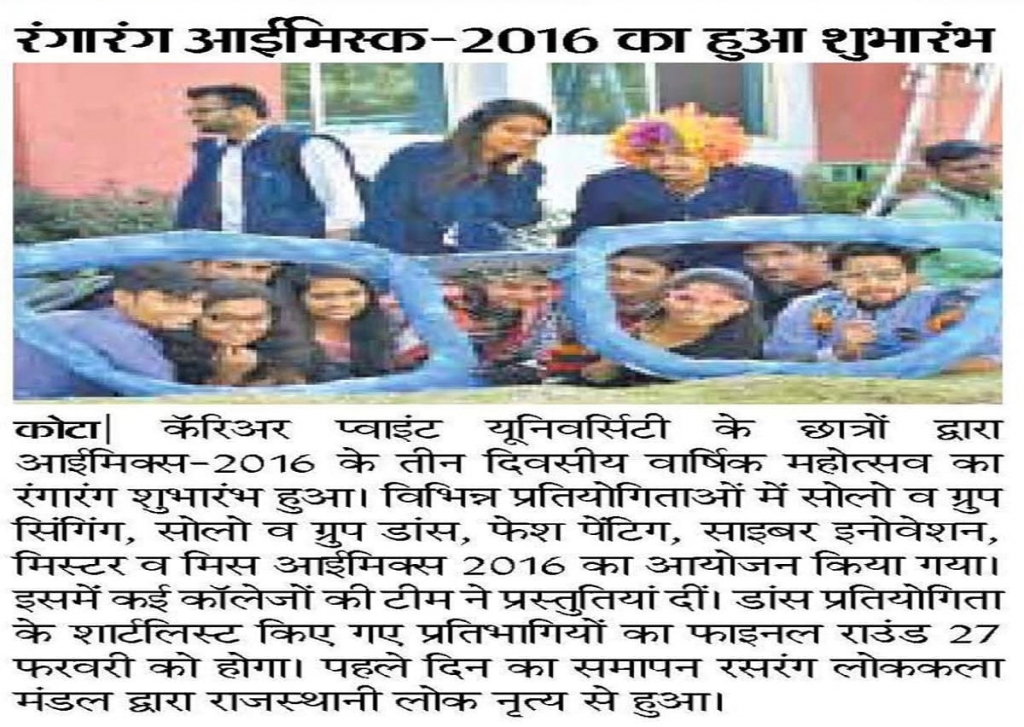 Career Point University, Kota hosted iMix 2014 from May 2–4, blending art, culture, and technology with social outreach. The fest engaged participants aged 5–55 and promoted inclusivity through rural outreach and free transport.