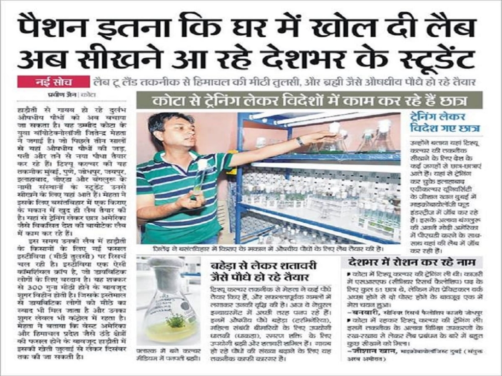 Biotech expert Jitendra Mehta from Kota has established a home-based tissue culture lab, reviving rare medicinal plants like Stevia and Brahmi. His work attracts students nationwide, many of whom now work in global biotech labs.