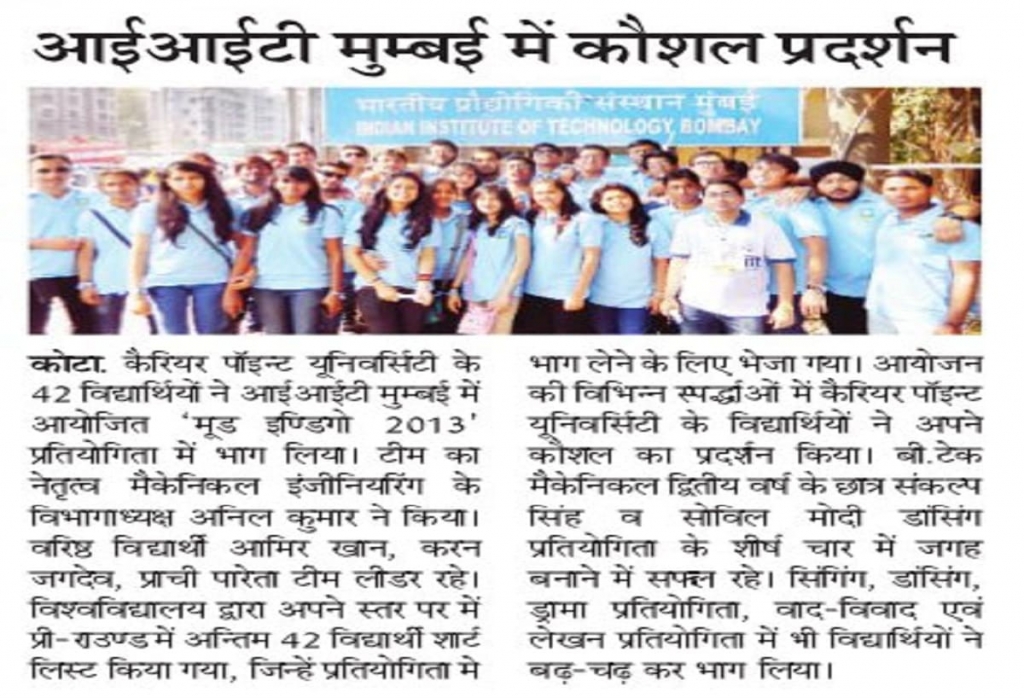 42 students from Career Point University showcased their talents at IIT Bombay’s 'Mood Indigo 2013', competing in dance, music, drama, debate, and writing. Notably, Sankalp Singh and Sovil Modi secured top-four positions in dance.