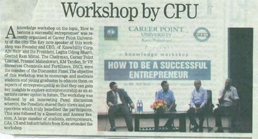 Career Point University hosted a workshop on "How to Become a Successful Entrepreneur" led by Ajit Nair and industry leaders. The event featured a panel discussion and Q&A with entrepreneurs, CAs, CSs, and industrialists from Kota.