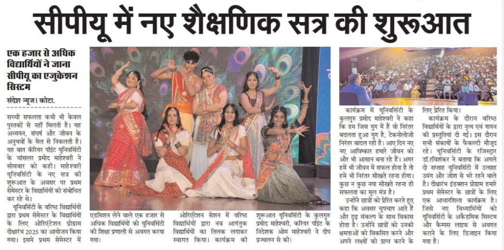 Career Point University, Kota, welcomed over 1,000 first-semester students through its Diksharambh 2025 orientation program. Chancellor Pramod Maheshwari motivated students to embrace continuous learning and innovation. The event featured cultural performances and sessions introducing students to CPU’s education system, academic structure, and campus life.
